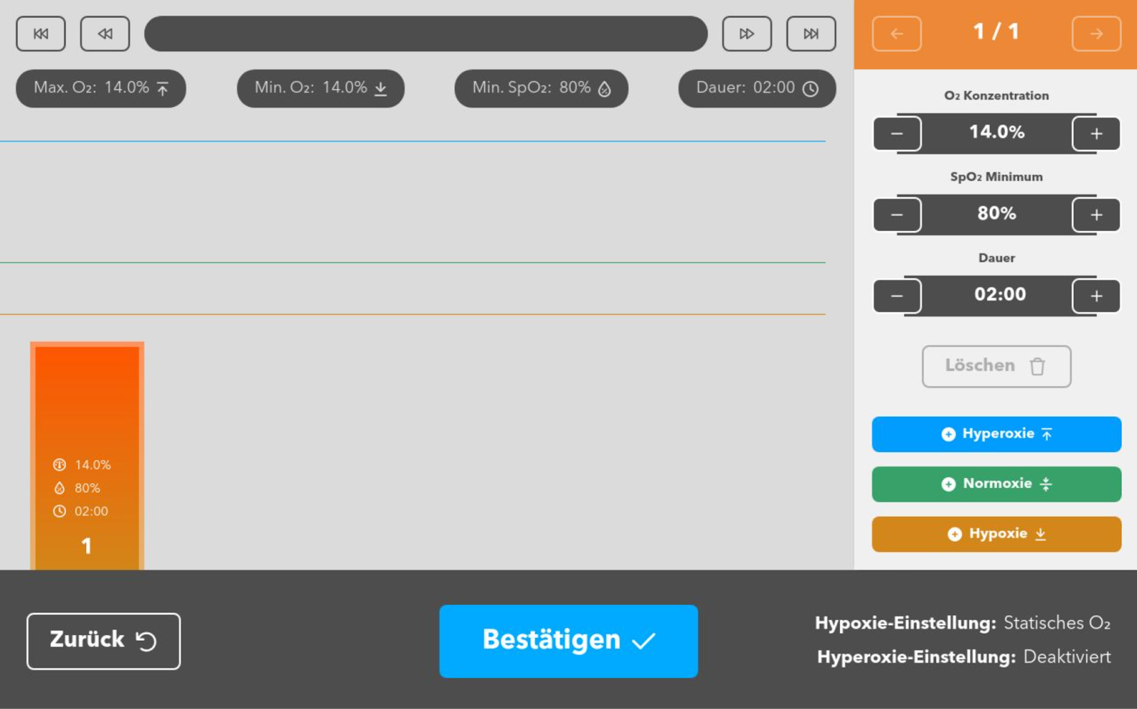 Weitere Phasen können über die farblich gekennzeichneten Schaltflächen „Hypoxie“, „Normoxie“ und „Hyperoxie“ hinzugefügt werden.
