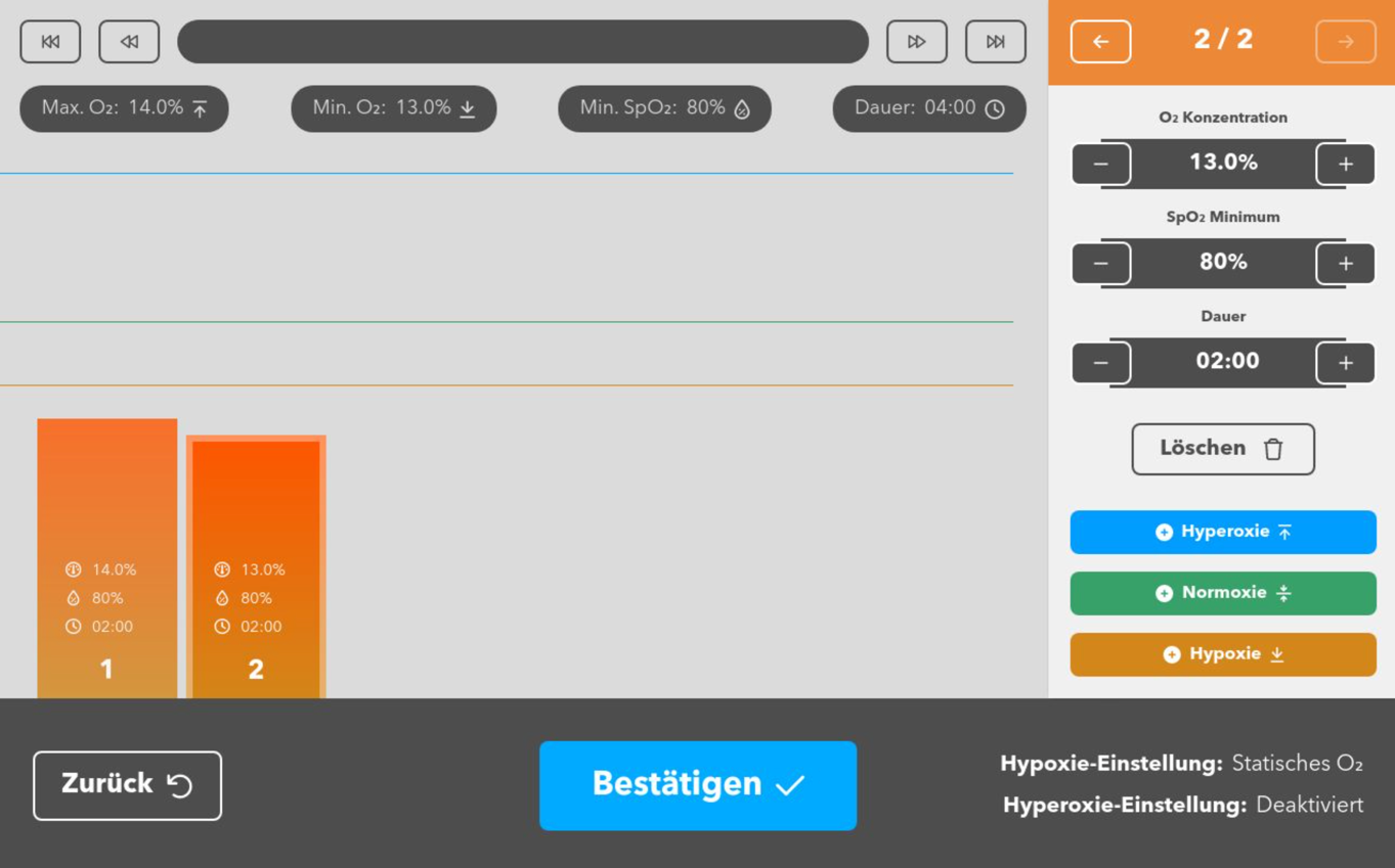 Wiederhole das Anlegen von Phasen nach Bedarf. Es können mehrere Zyklen aus Belastungs- (Hypoxie) und Regenerationsphasen (Hyperoxie oder Normoxie) erstellt werden. Bereits angelegte Phasen können durch Antippen ausgewählt und bei Bedarf geändert werden.