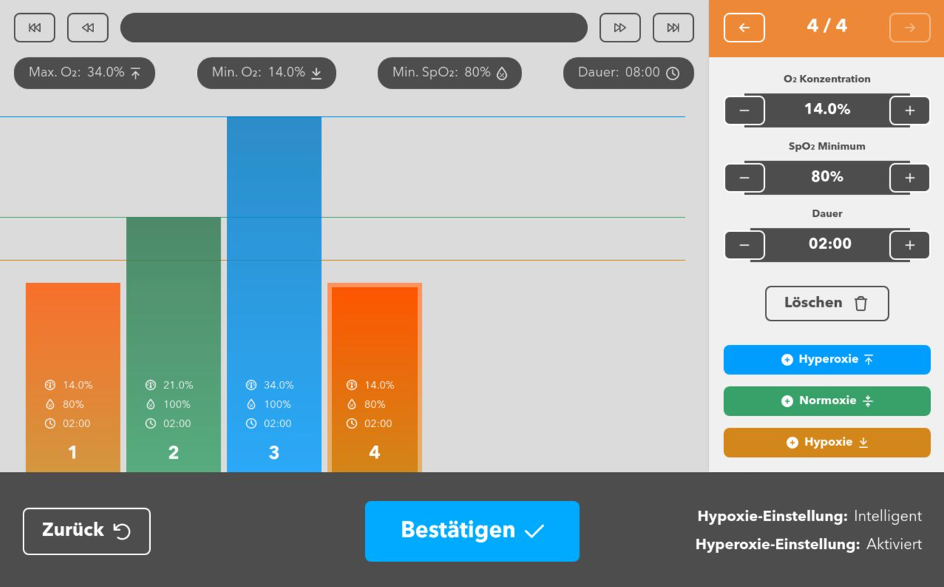 Während der Hypoxie-Phasen wird die eingestellte O₂-Konzentration zugeführt. Wird die Minimum-SpO₂-Sättigung erreicht, wechselt das Gerät für den Rest der Phase automatisch auf Normoxie.
