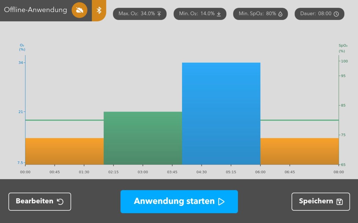 Sollte die Cloud nicht erreichbar sein, oder grundsätzlich nur im Offline-Modus trainiert werden, kann ein manuelles Programm angelegt werden. Die Phasenlängen sowie der Sauerstoffgehalt für Hypoxie und Hyperoxie bzw. Normoxie können für jede Phase individuell eingestellt werden. Ein Programm kann beliebig viele Phasen haben. Die Phasen- und Gesamtlänge des Programms sind individuell konfigurierbar. Die Gesamtlänge ist auf 90 Minuten beschränkt. Vor Erstellung des Programms muss der Modus, "Bio-Feedback", "Statisch O2" oder "Intelligente Hypoxie" festgelegt werden. Im Offline-Modus können sowohl die Programm-Phasen als auch die Sauerstoffkonzentration der Atemluft während der Anwendung nicht verändert werden.