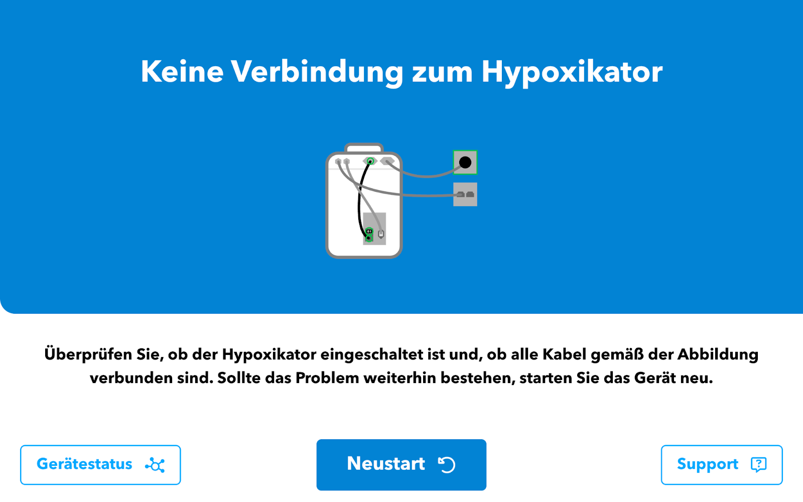 Die Fehlermeldung wird angezeigt, wenn der Web-Panel die Verbindung zum Hypoxikator verloren hat oder nicht herstellen kann.